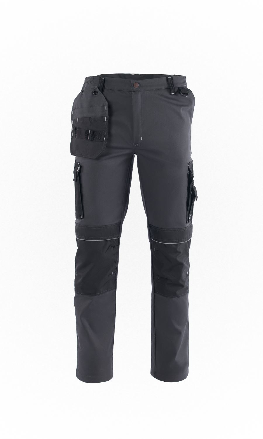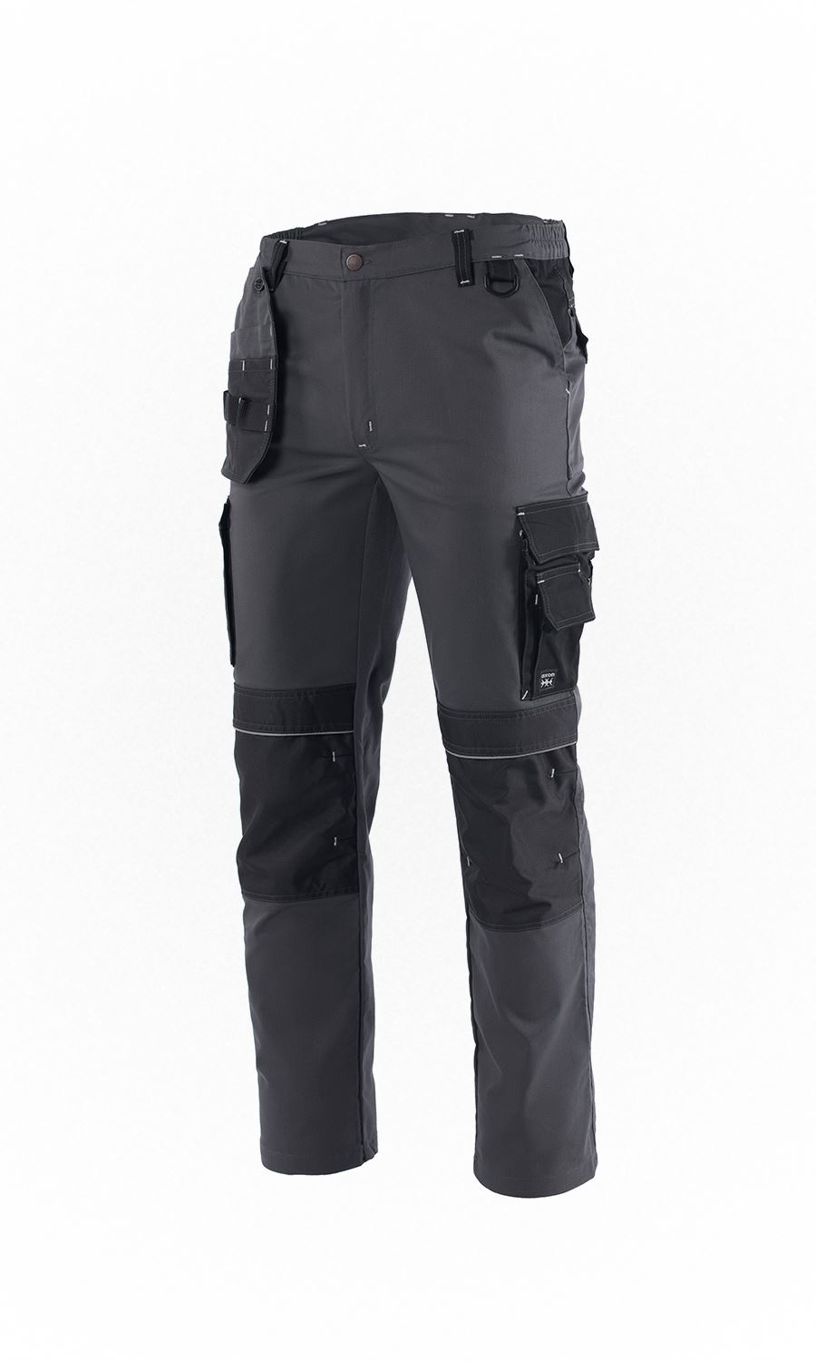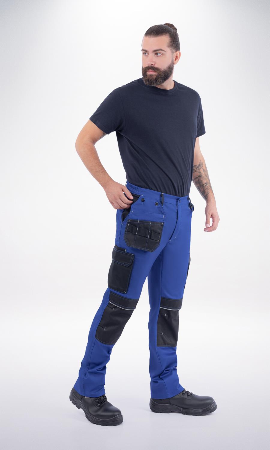 Ελαστικό, εργατικό παντελόνι που κλείνει μπροστά με φερμουάρ υψηλής αντοχής και μεταλλικό κουμπί. Διπλή πλαϊνή τσέπη στον αριστερό μηρό και διπλή στο δεξιό μηρό που κλείνουν με καπάκι και velcro. Οι τσέπες φέρουν ανακλαστικά σιρίτια. Δύο τσέπες λοξές μπροστά και δύο τσέπες πίσω με καπάκι. Αποσπώμενη θήκη εργαλείων. Θήκη για επιγονατίδες με ανακλαστικά σιρίτια. Πέντε θηλύκια για συγκράτηση ζώνης. Γαζιά ασφαλείας. Κρίκος πρόσδεσης εργαλείων. Ελληνικό προϊόν.