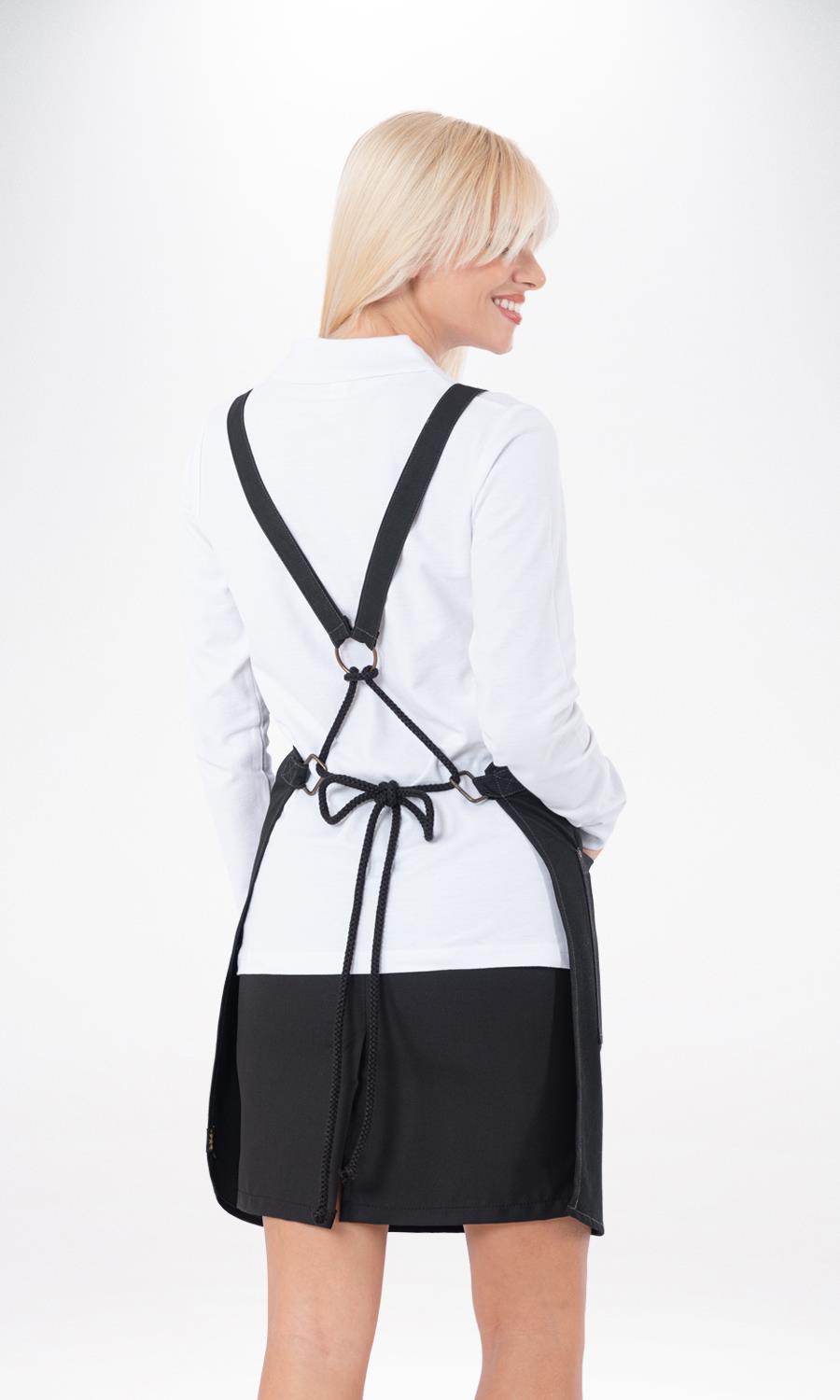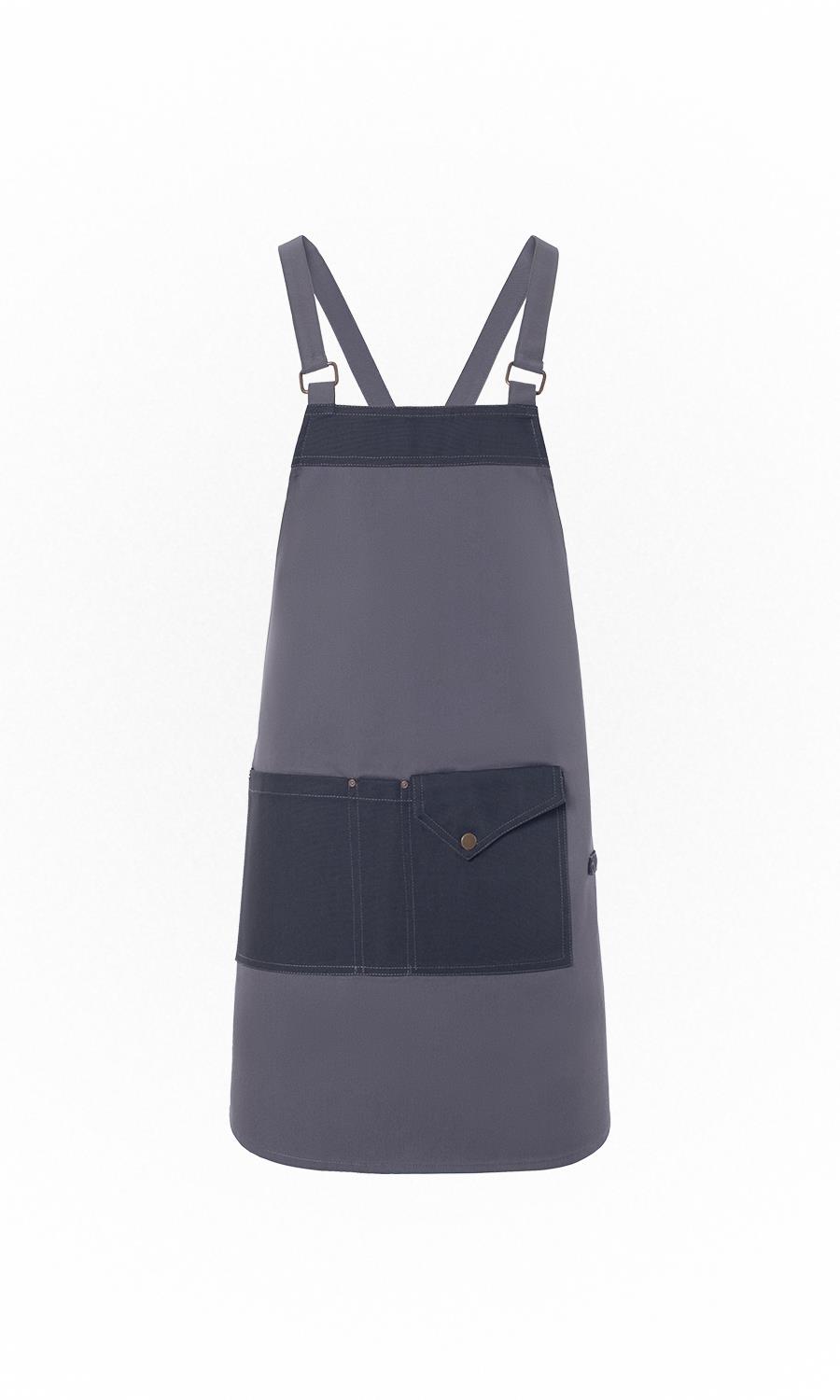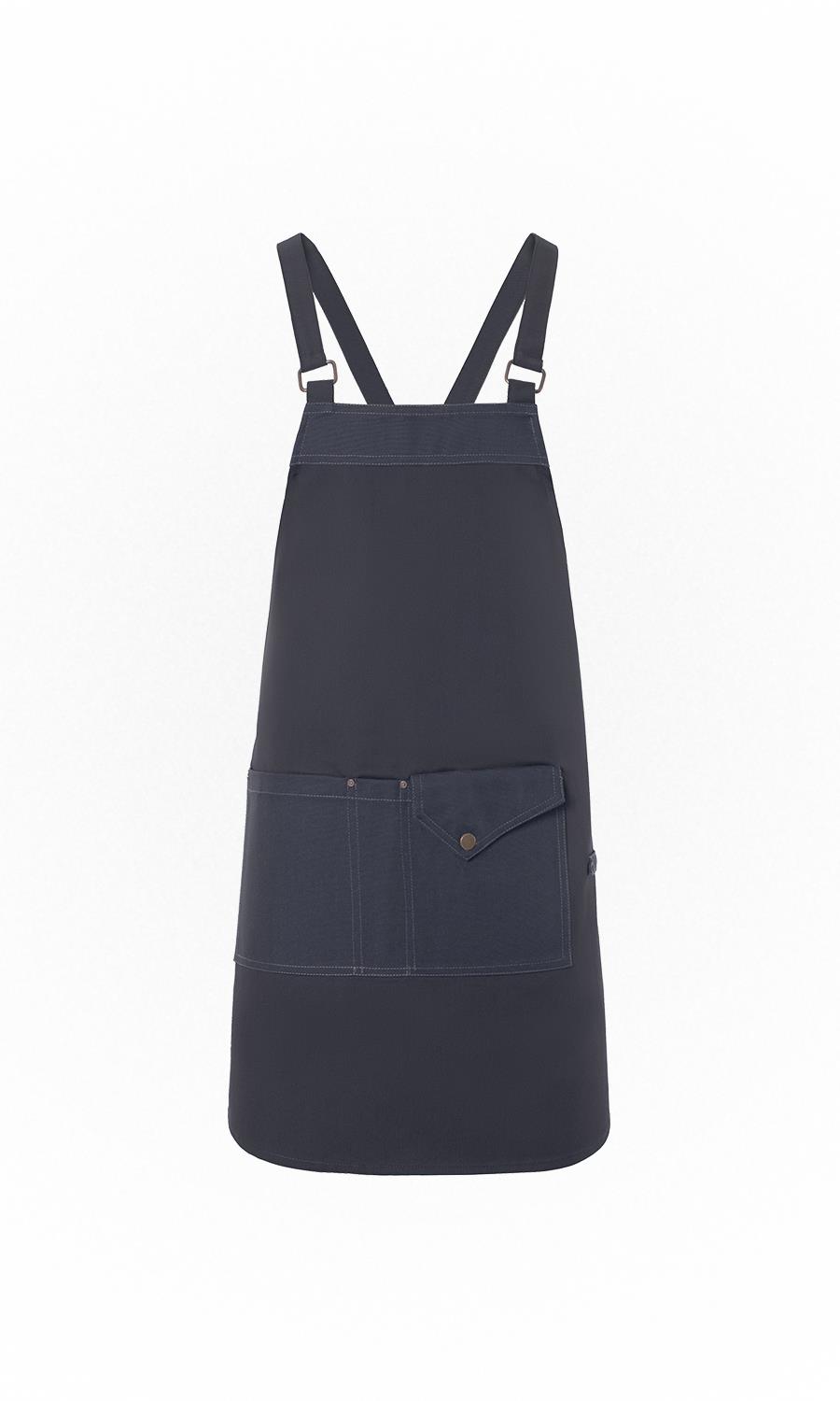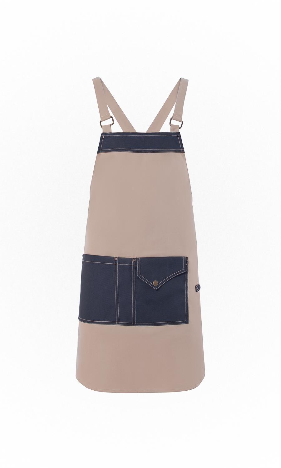 Ποδιά λαιμού με τιράντες και χιαστί κορδόνια στο πίσω μέρος με μεταλλικό κρίκο. Τριπλή τσέπη μπροστά όπου η μία κλείνει με καπάκι και τρούκ. Θηλύκι για τοποθέτηση πετσέτας. Διακοσμητικά πιρτσίνια. Οι τσέπες είναι κατασκευασμένες από καμβά 320gsm. Ελληνικό προϊόν.