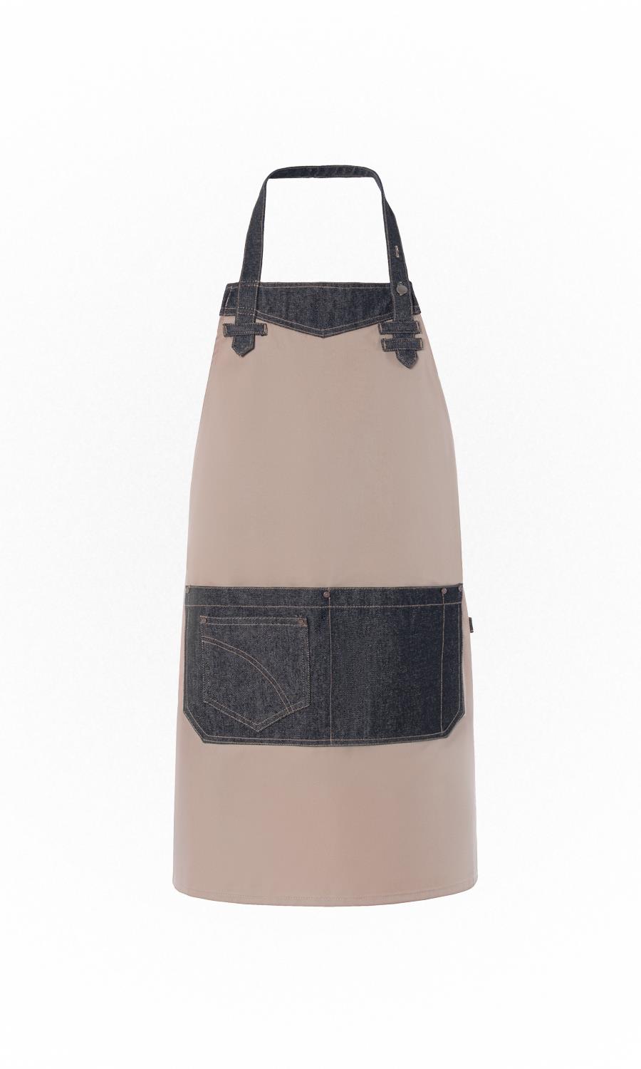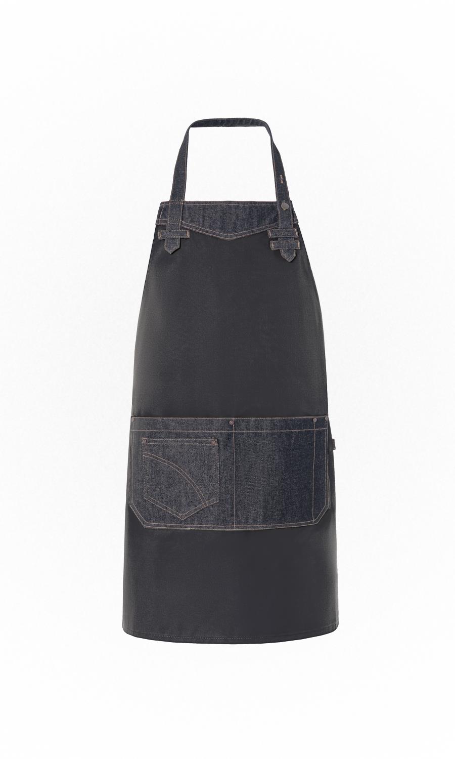 Ποδιά λαιμού με τζιν λεπτομέρειες. Ρυθμίζει στον λαιμό με μεταλλικό κουμπί. Δένει πίσω με ζωναράκια. Τριπλή τσέπη εμπρός κατασκευασμένη από τζιν 11oz . Θηλύκι για τοποθέτηση πετσέτας από τζιν στα αριστερά. Διακοσμητικά πιρτσίνια. Ελληνικό προϊόν.